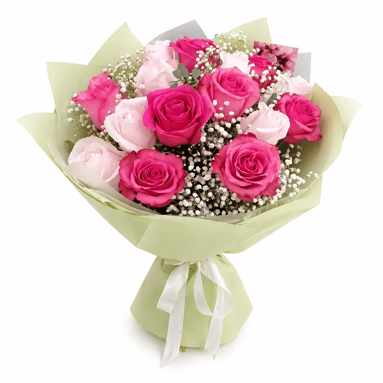 Букет из 15 белых и розовых роз с гипсофилой - это утончённая композиция, наполненная гармонией и воздушной красотой. Белые розы символизируют искренность и чистоту чувств, розовые - нежность, заботу и тёплые эмоции, а гипсофила добавляет букету лёгкость, объём и эффект «облачной» романтики.