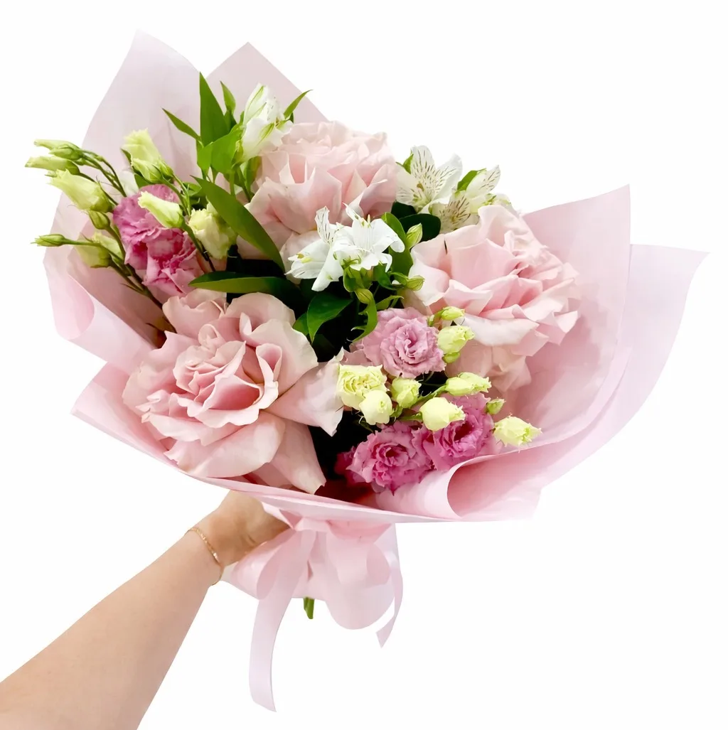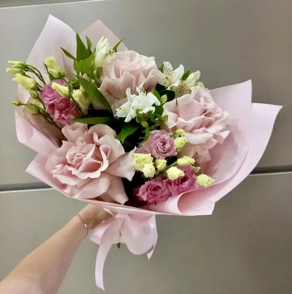 роза-3шт,эустома-2шт, альстромерия - 2шт, упаковка, лента |