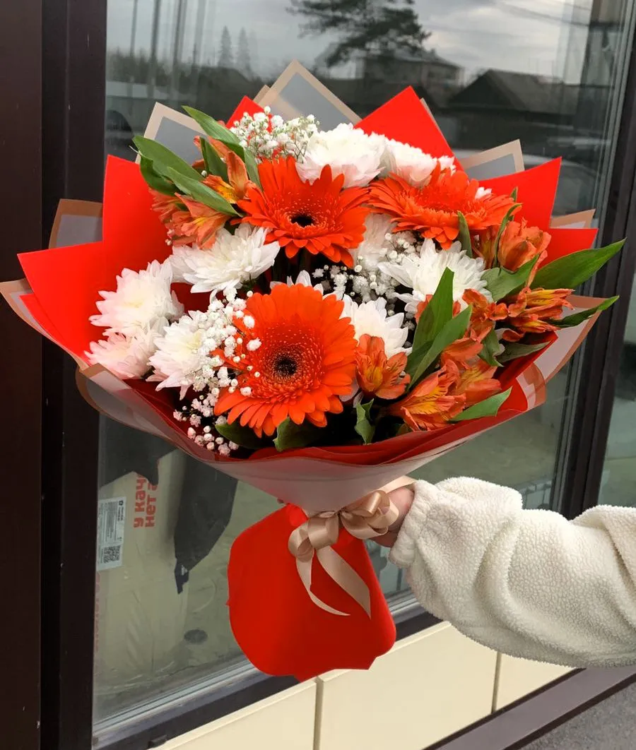 - Средний - гербера - 5 шт., хризантема - 4 шт., альстромерия - 5 шт., зелень, упаковка, лента