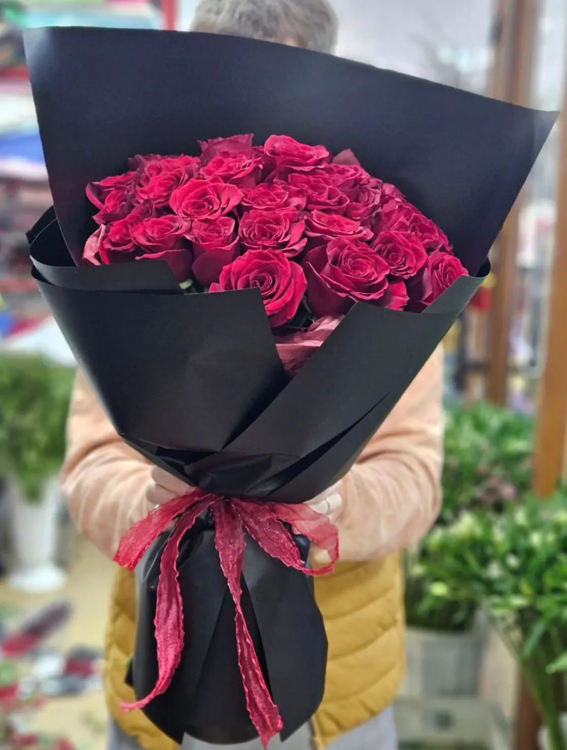 Контрастная чёрная упаковка подчёркивает яркость роз и придаёт букету современный, стильный характер. Такое оформление делает композицию особенно эффектной и запоминающейся, идеально подходящей для важного признания или торжественного подарка