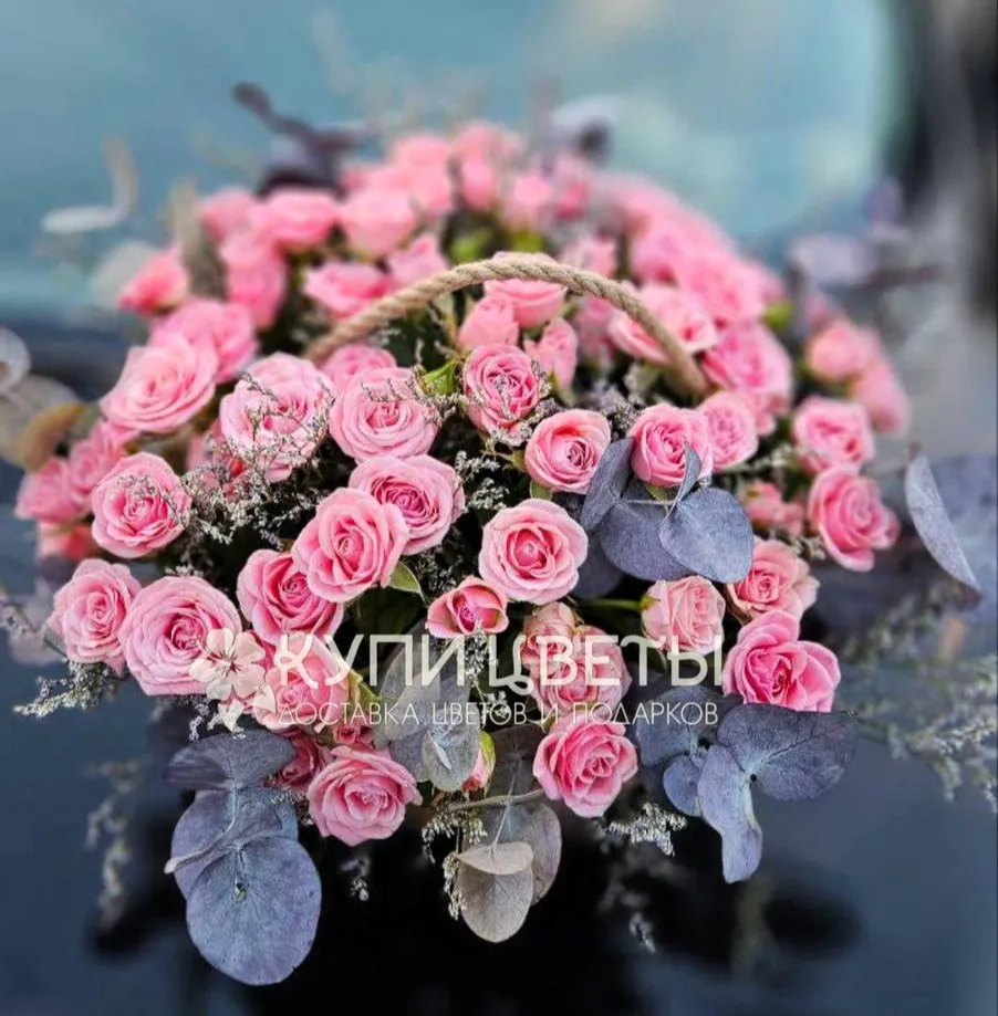 В этой великолепной корзине расцветает нежность розовых кустовых роз. Множество мелких, но пышных бутонов, собранных в соцветия, словно россыпь драгоценных камней, добавляют композиции объем и легкость. Их мягкие, бархатистые лепестки излучают утонченную красоту и символизируют восхищение, нежность и признательность.