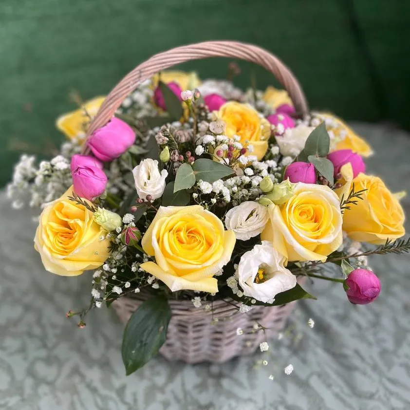 Одноголовые розы - 9 шт., кустовые розы - 3 шт., эустомы - 3 шт., гипсофила, зелень, оазис, корзина |