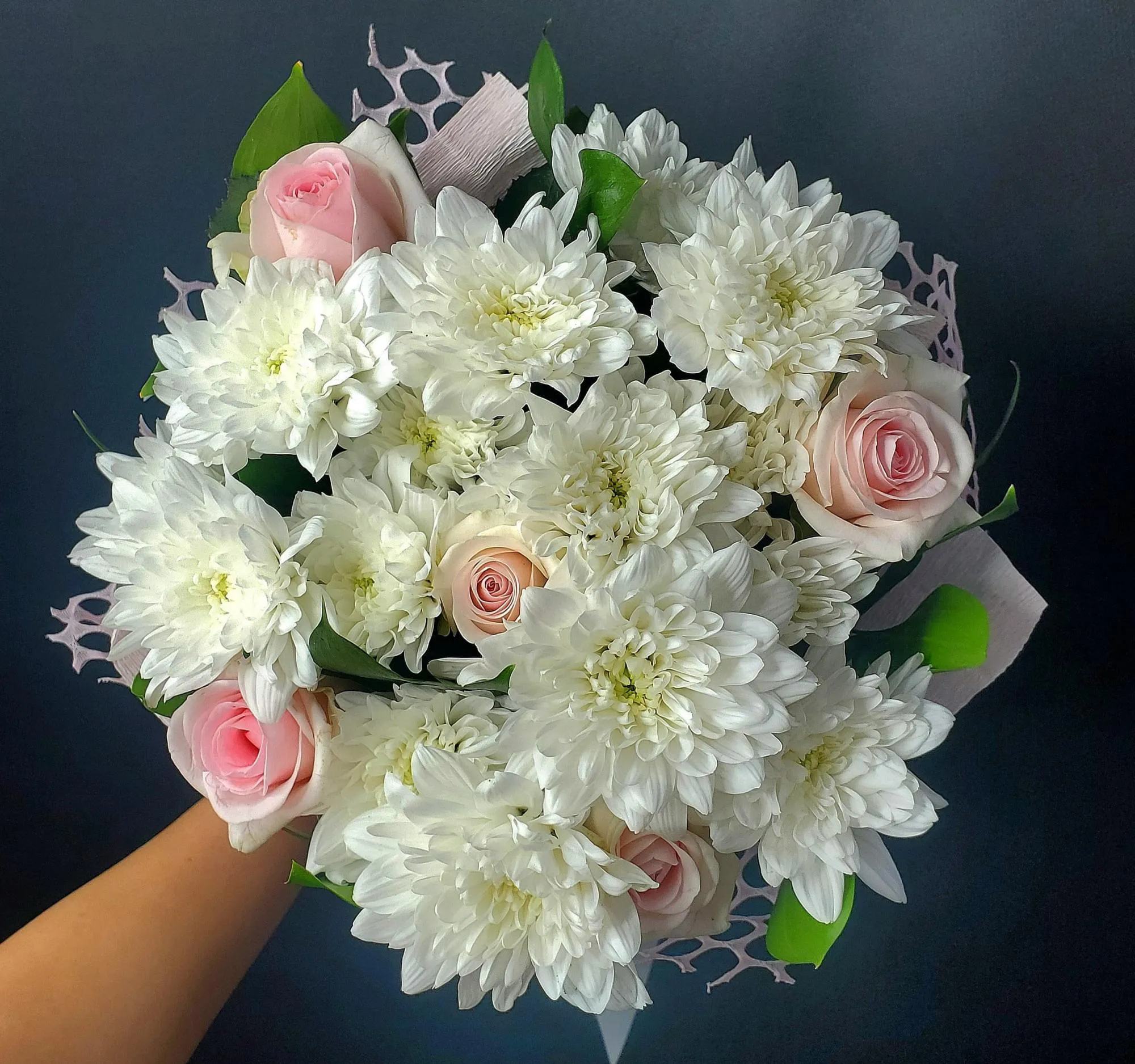 - Средний - кустовая хризантема - 4 шт., роза - 5 шт., упаковка лента