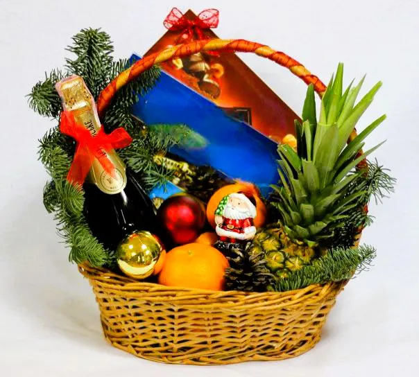 Апельсины, ананас, коробка конфет-2 шт., напиток по выбору, нобилис, новогодний декор, корзина |