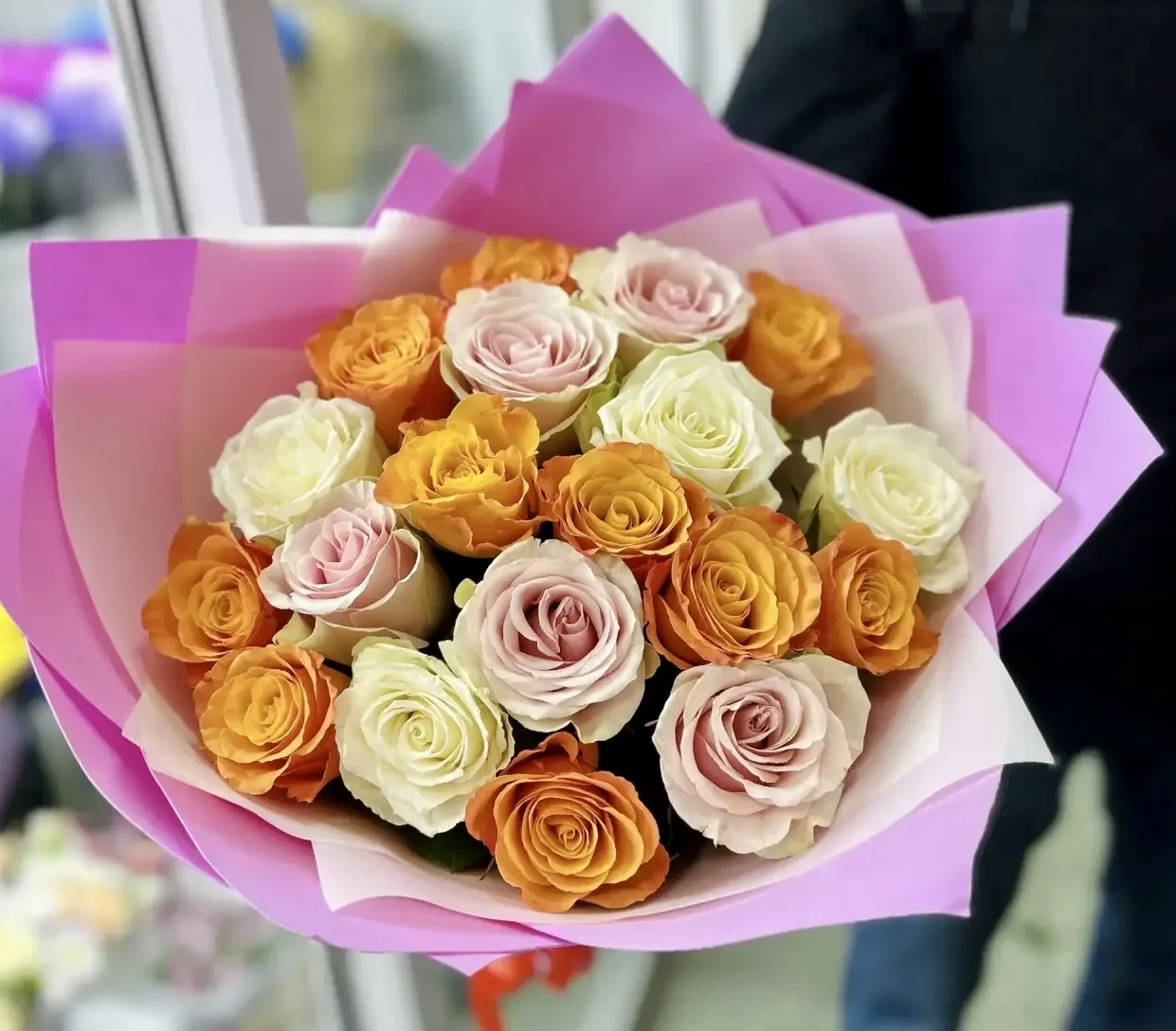 Аккуратная упаковка подчёркивает игру оттенков и придаёт букету завершённый, подарочный вид. Такой букет идеально подойдёт для дня рождения, поздравления, благодарности или просто как способ поднять настроение близкому человеку.