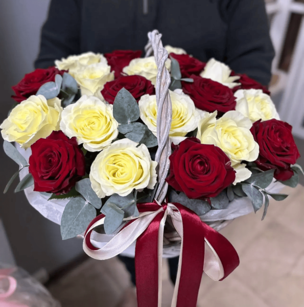 Элегантная композиция в корзине из белых и красных роз с эвкалиптом - это гармоничное сочетание страсти, нежности и утончённого вкуса. Насыщенные красные розы символизируют любовь и восхищение, белые розы олицетворяют чистоту и искренность чувств, а свежий эвкалипт добавляет композиции лёгкость, природную свежесть и благородный аромат.