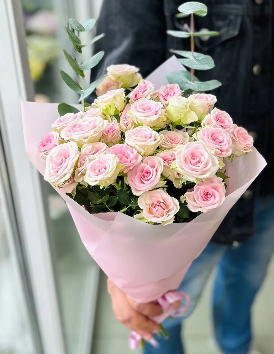- Средний - кустовая роза - 7 шт., зелень, упаковка, лента
