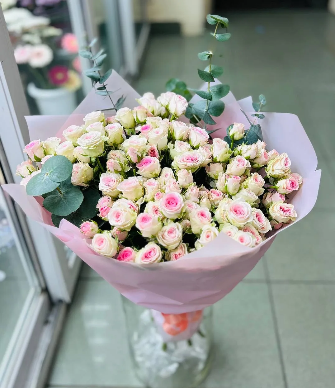 Милое оформление розовых цветов показывает расположенность и искреннее желание поднять настроение близкому человеку.