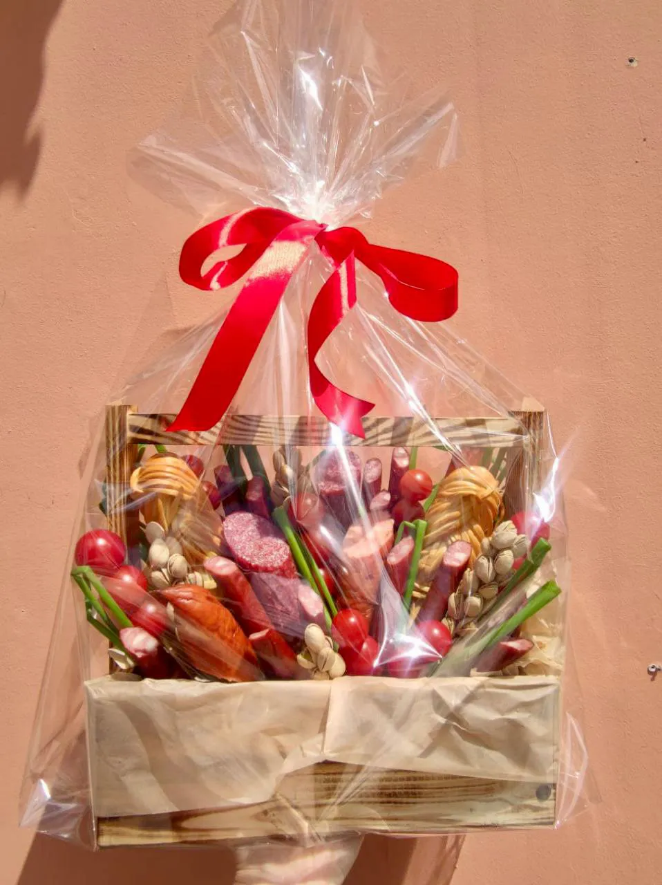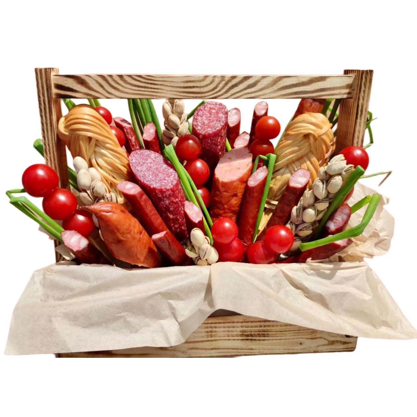 Состав: колбаса, хлеб, сыр, перец, черри, колбаски, корзина. |