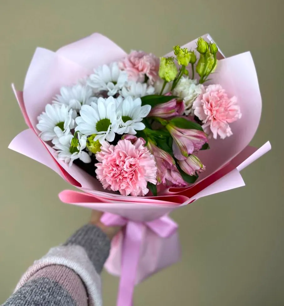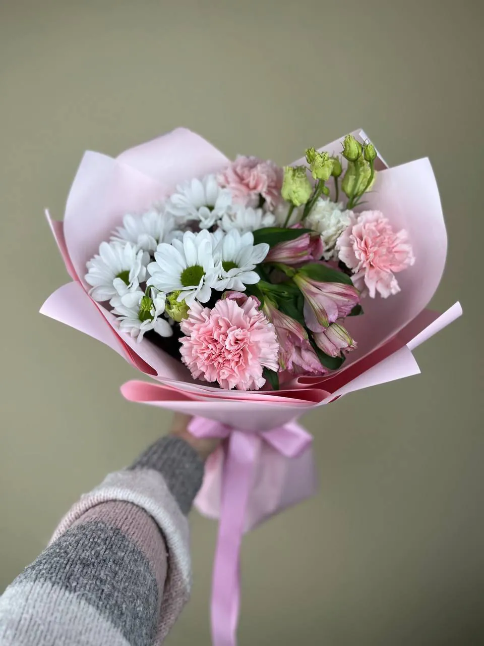 Одна белая эустома, как яркая звезда, добавляет нотку элегантности и утонченности, а розовые гвоздики завершают этот великолепный ансамбль, привнося в него особую романтику. Все цветы заключены в нежную розовую упаковку, которая подчеркивает их красоту и создает атмосферу праздника. Этот букет станет идеальным подарком для близкого человека или прекрасным декором для любого торжества, вызывая улыбку и радость.