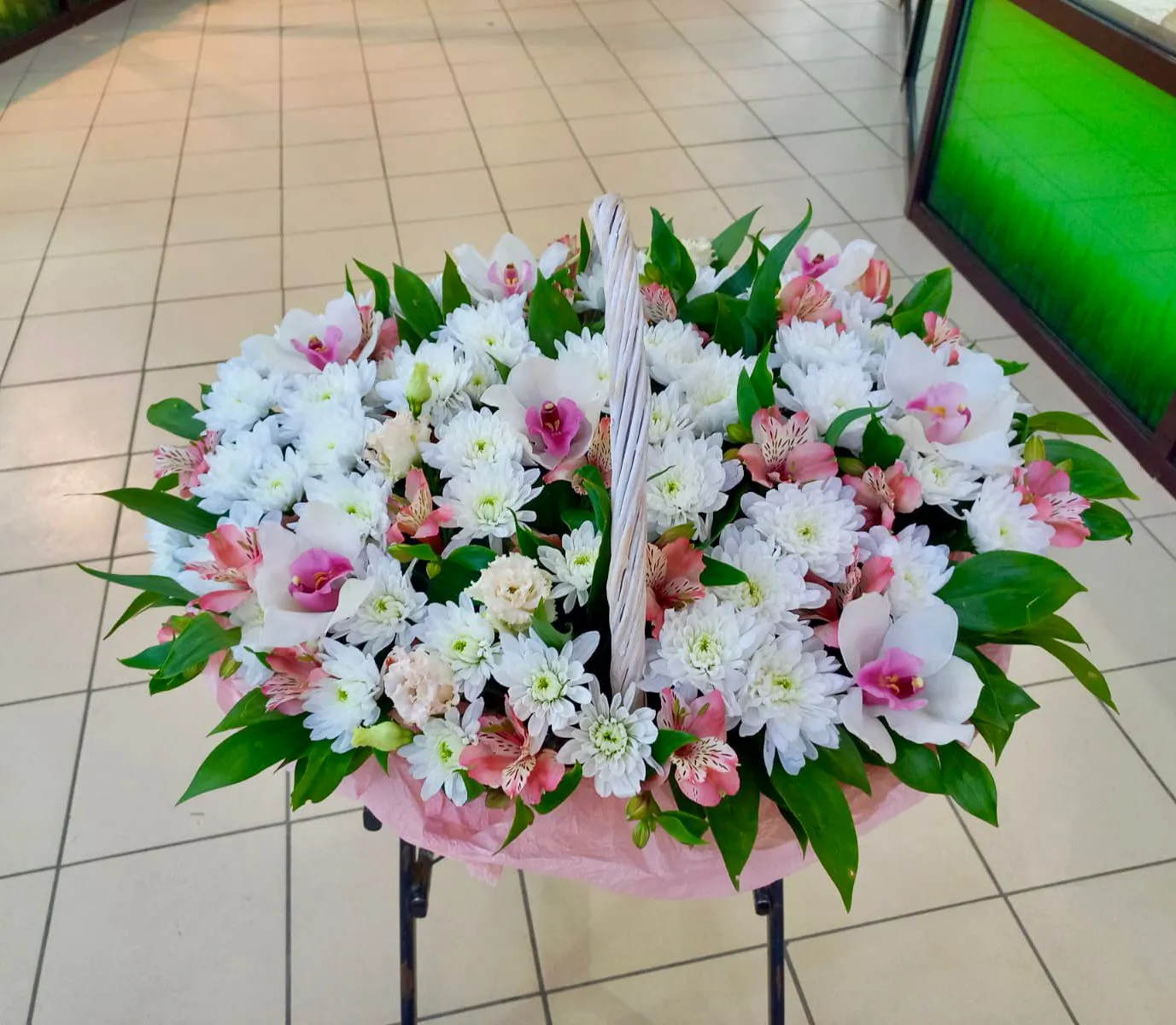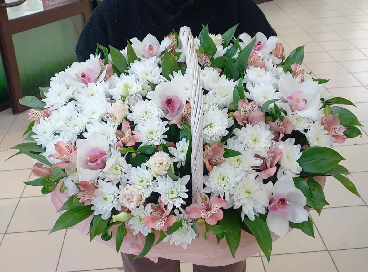 - Премиум (на фото) - хризантема кустовая - 7 шт. орхидея цимбидиум бутон - 7 шт. лизиантус - 3 шт.,кустовая роза-3 шт, зелень, оазис, корзина