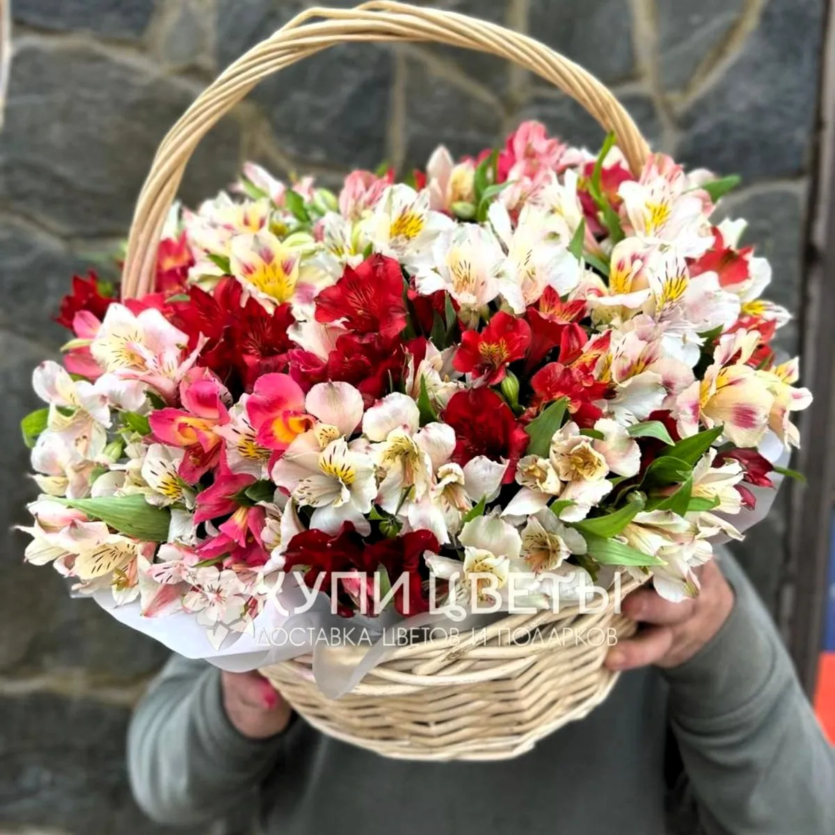 - Премиум - альстромерия - 31 шт., декоративная зелень, оазис, корзина