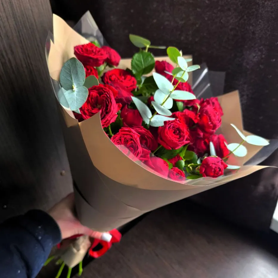- Премиум -кустовая роза - 9 шт., зелень, упаковка, лента