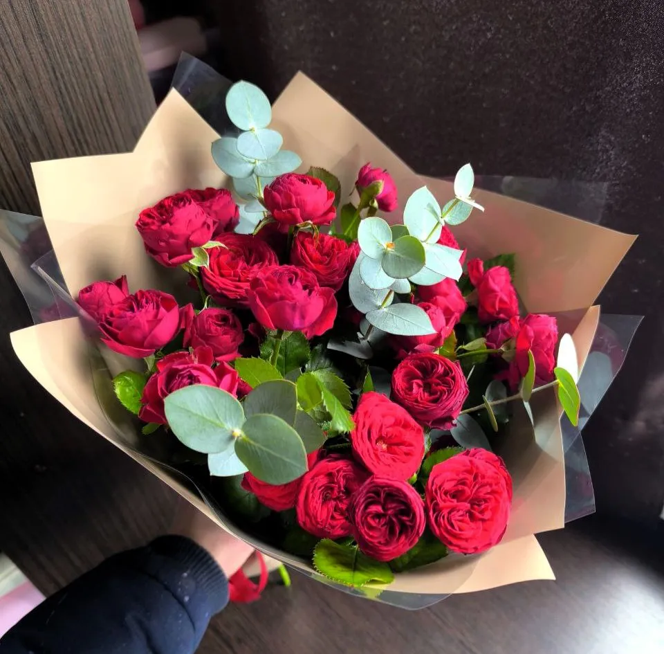 Пионовидные розы, зелень, упаковка, лента |
