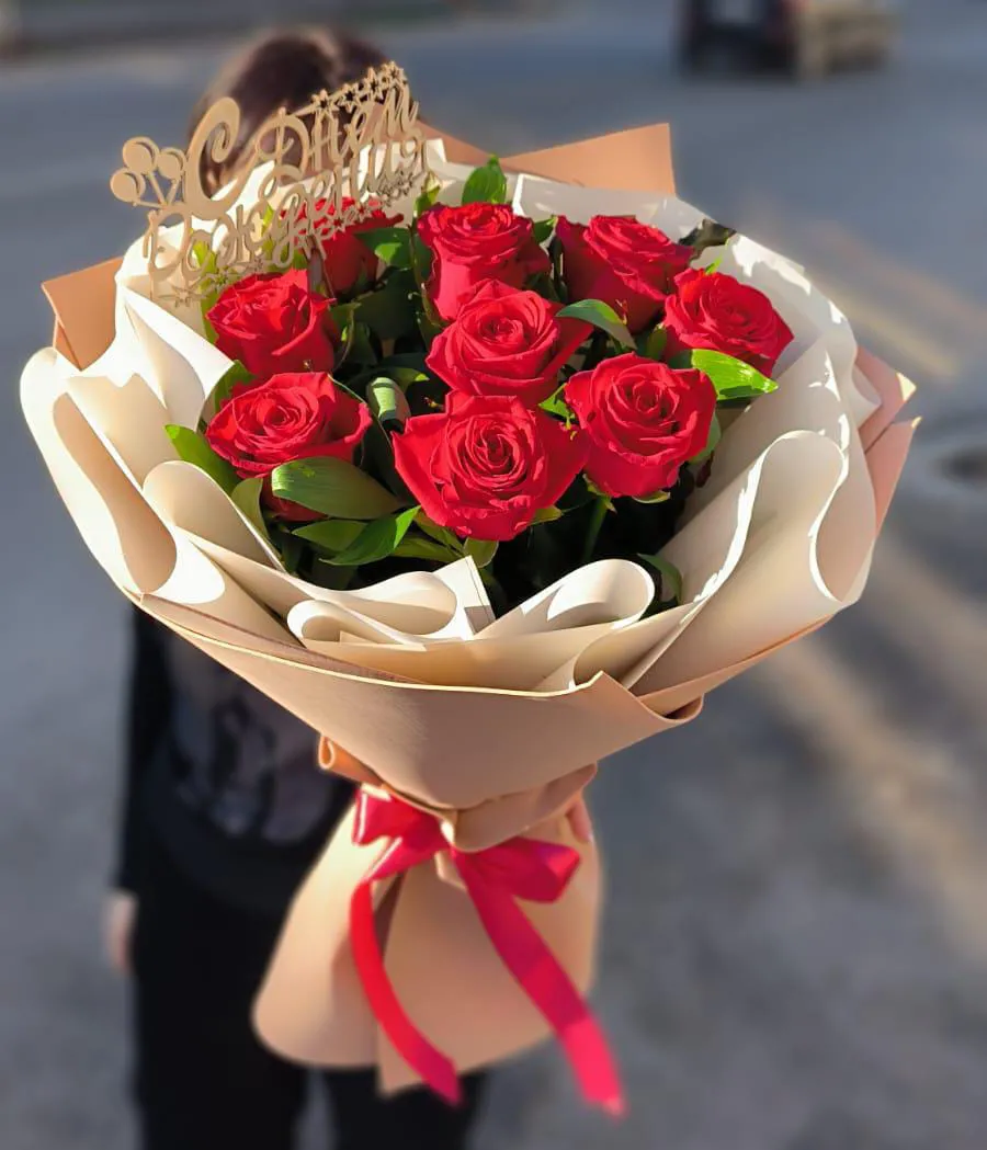 - Средний - роза - 9 шт., зелень, топпер, упаковка, лента