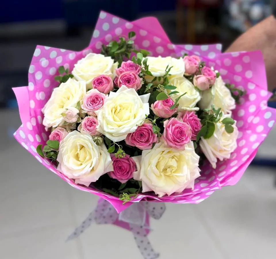 одноголовые розы, кустовые розы, зелень, упаковка лента |