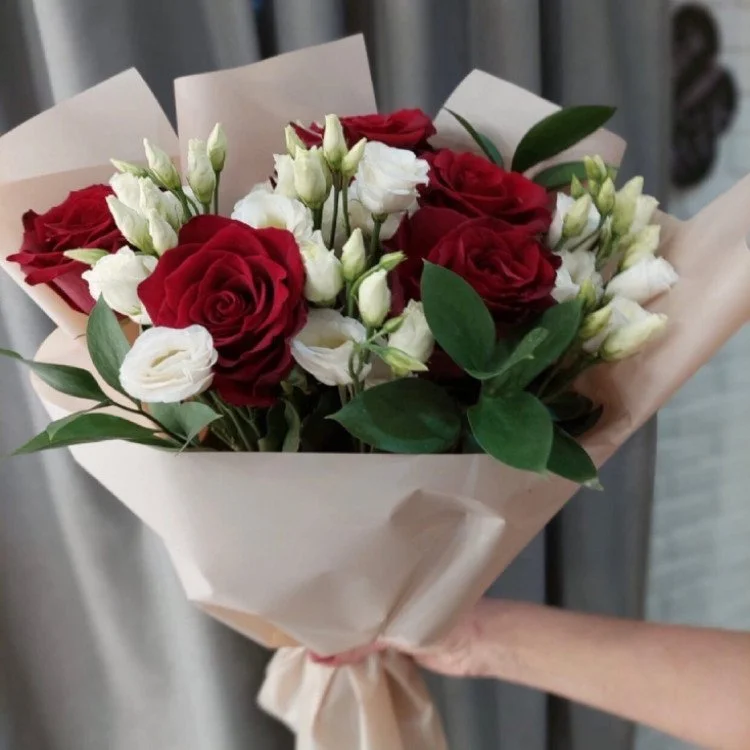 - Средний - роза 7 шт., эустома 4 шт., зелень, упаковка, лента