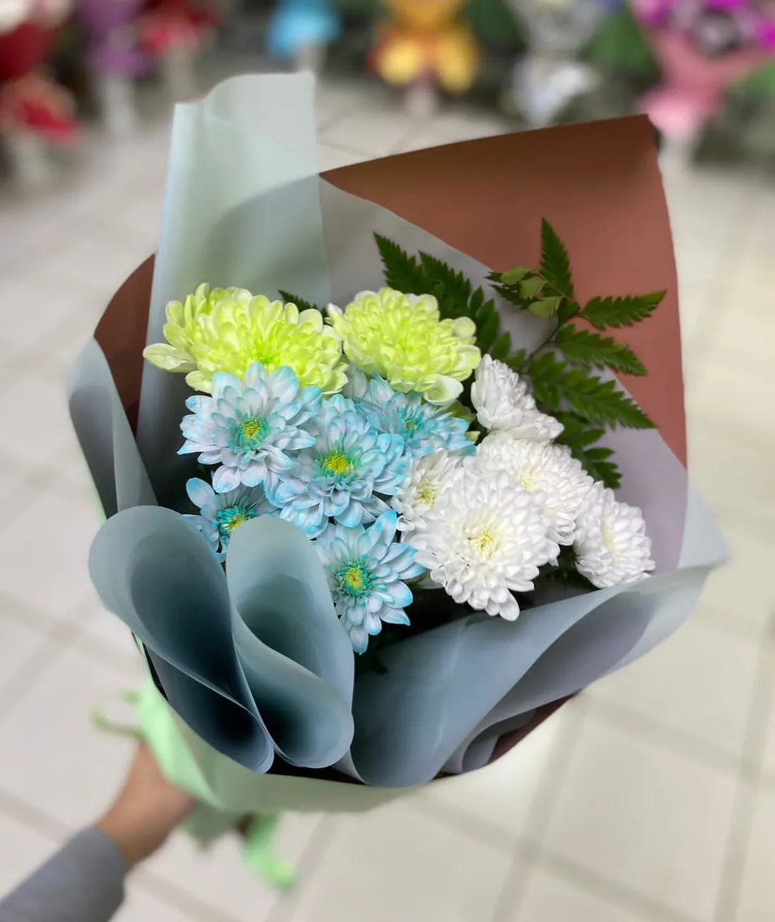 Кустовая хризантема, зелень, упаковка, лента |