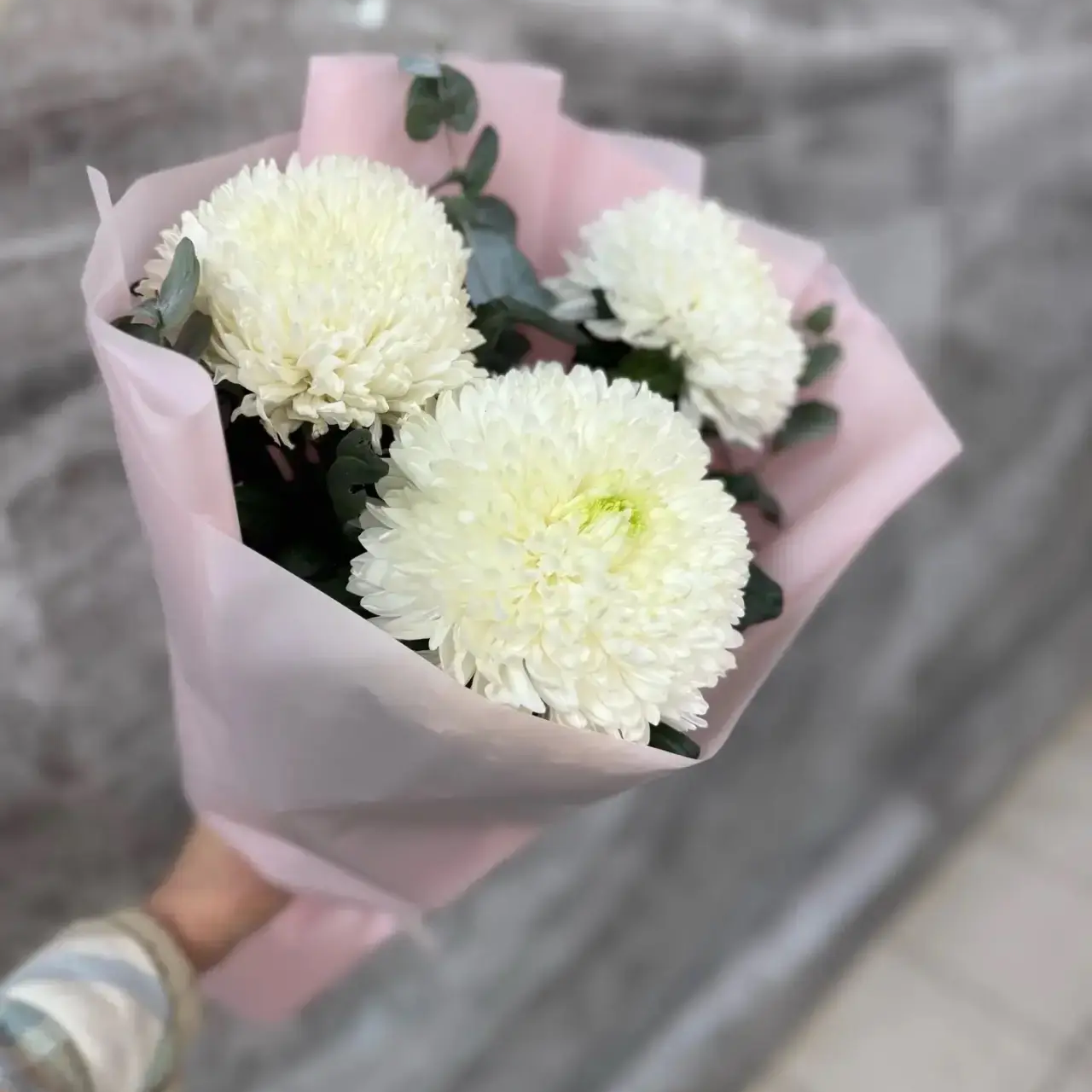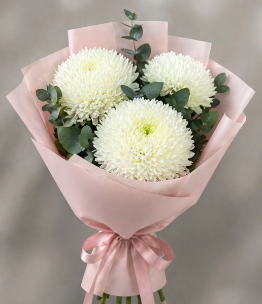 хризантема - 3 шт., зелень, упаковка, лента |