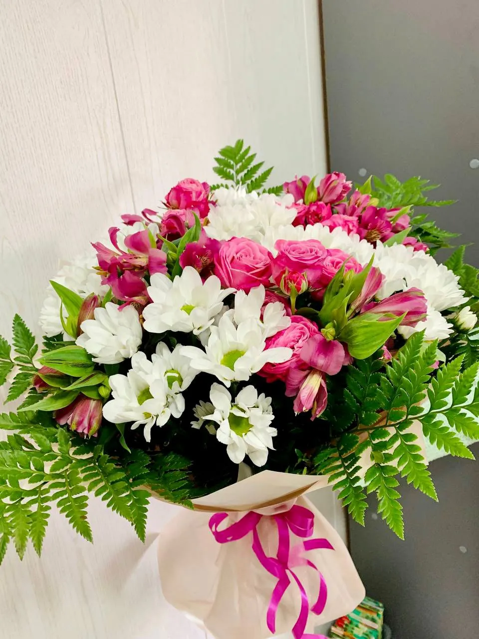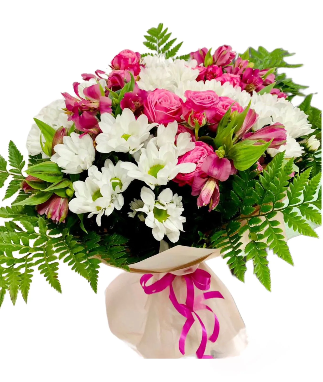 - Средний - кустовая роза - 5 шт., альстромерия - 4 шт., хризантема - 2 шт., зелень, упаковка, лента