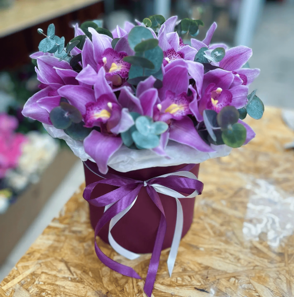 Шляпная коробка не только подчеркивает премиальный вид цветов, но и делает композицию максимально удобной - она не требует вазы и сохраняет свежесть дольше благодаря флористической основе внутри.