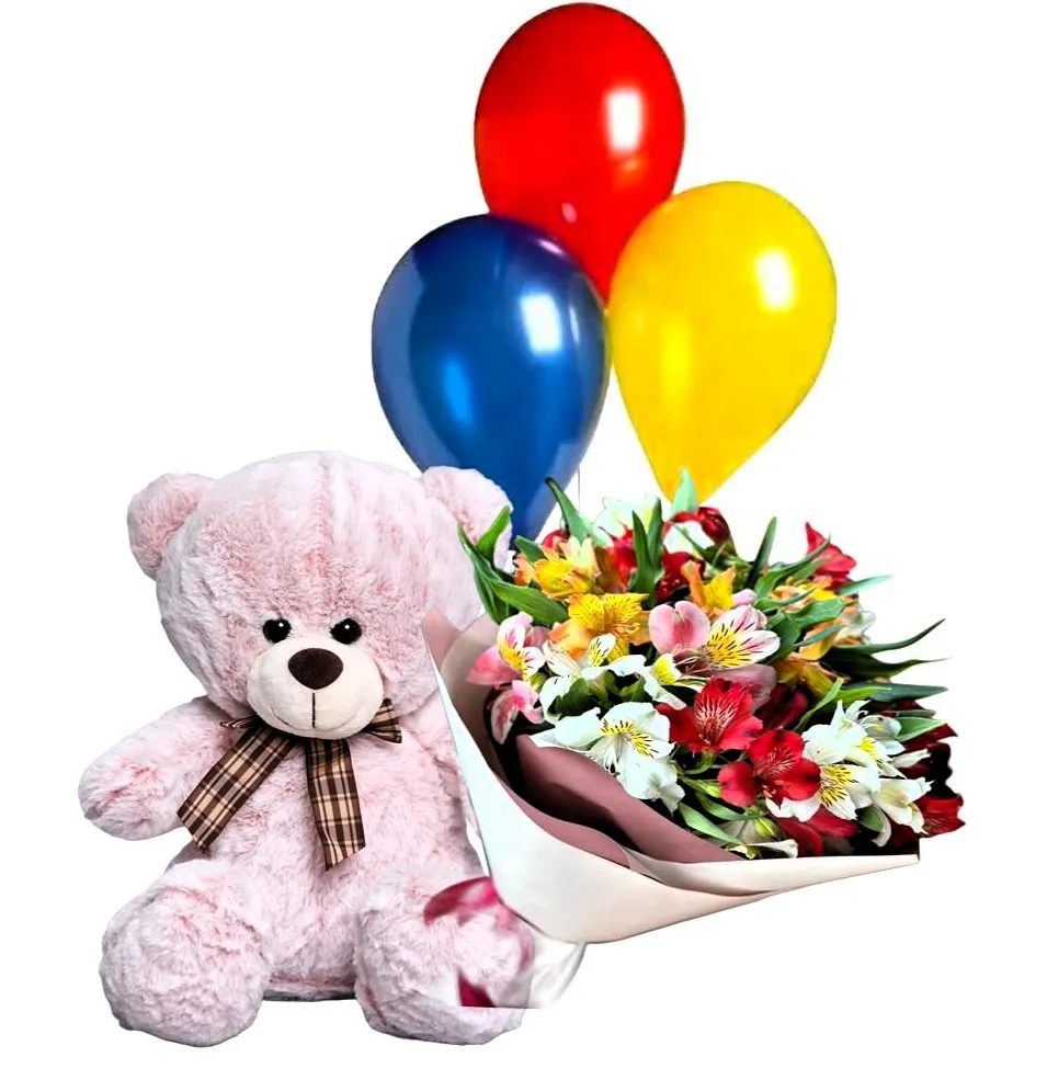 альстромерия - 9 шт., упаковка, лента+ 3 шарика+ мягкая игрушка 45 см |