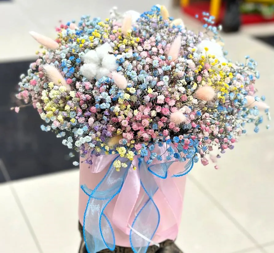 Радужная гипсофила, хлопок, шляпная коробка, оазис |