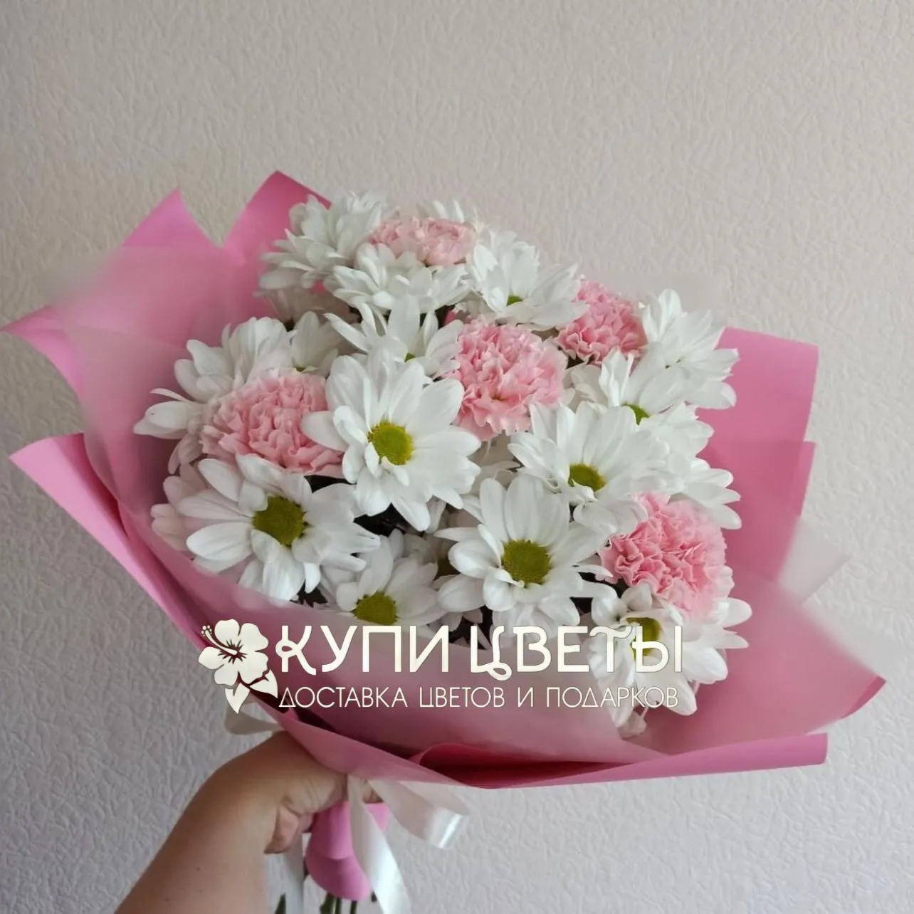 - Средний - гвоздики - 9 шт., кустовая хризантема - 4 шт., зелень, упаковка, лента