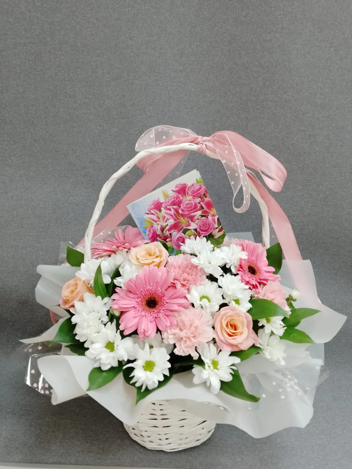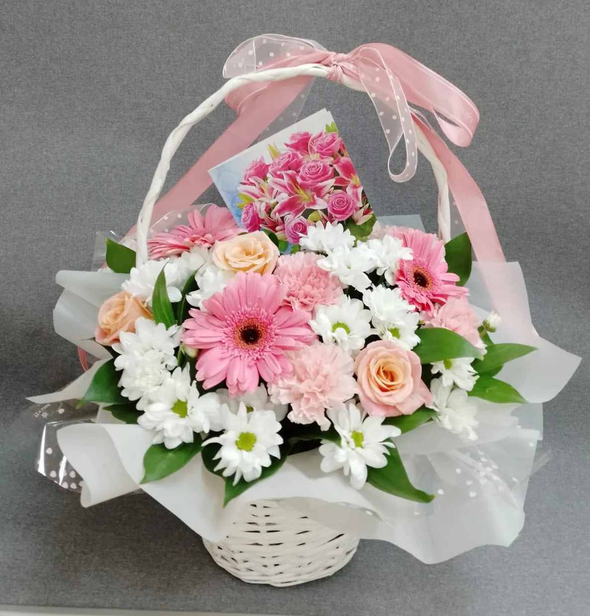 Одноголовая роза, гербера, гвоздика, кустовая хризантема, зелень, корзина, лента |