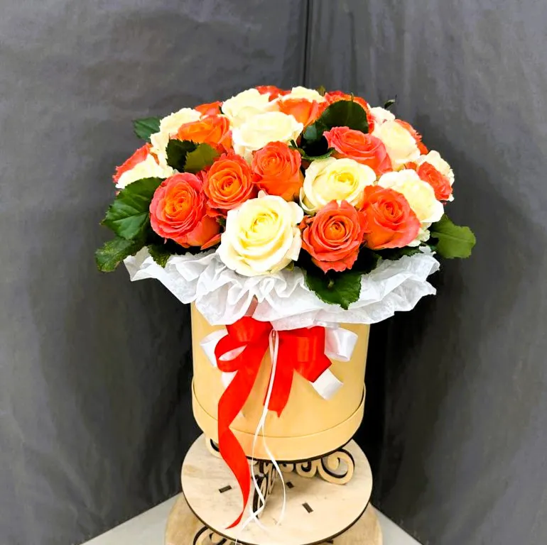 розы,зелень оазис, шляпная коробка |