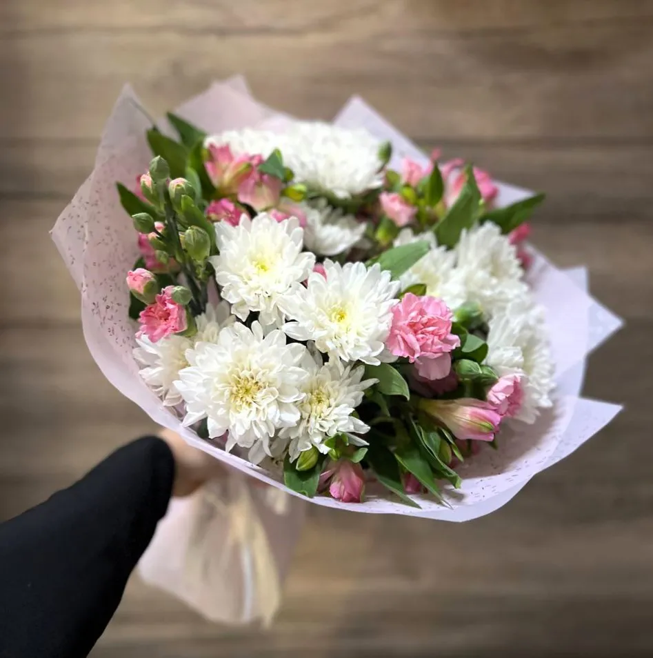 Кустовая хризантема, альстромерия, упаковка,лента |