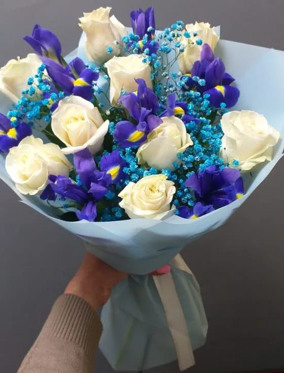 - Премиум - роза - 13 шт., ирис - 18 шт., гипсофила , упаковка, лента