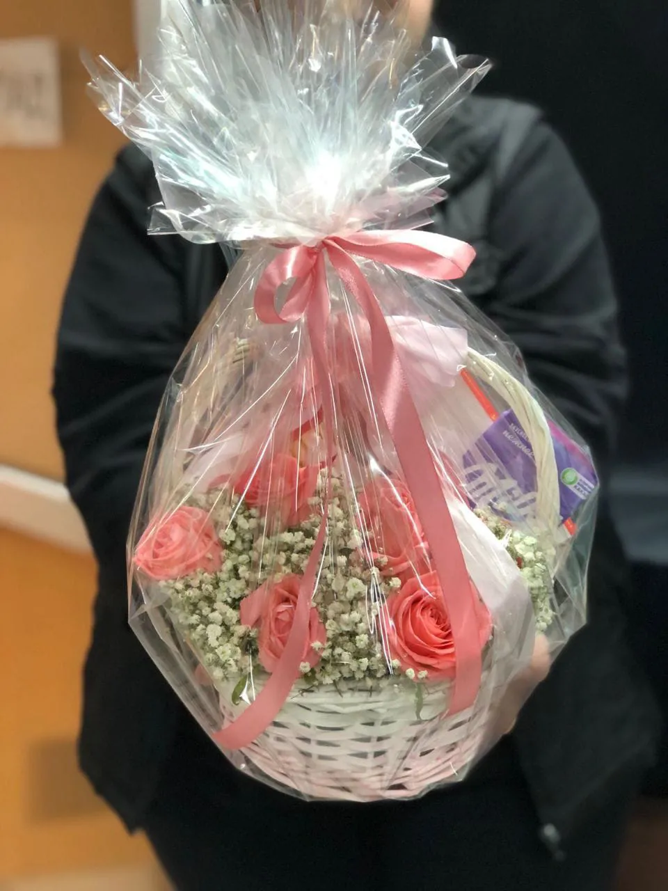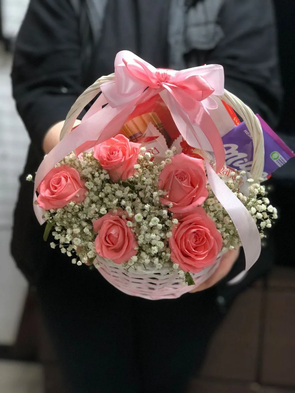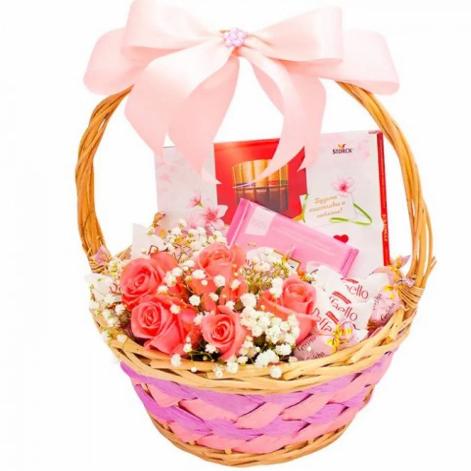роза - 5 шт., гипсофила - 2 шт., коробка конфет Merci - 1 шт., коробка Raffaello (150 гр.) - 1 шт., шоколадная плитка - 1 шт., корзина, оазис, лента |