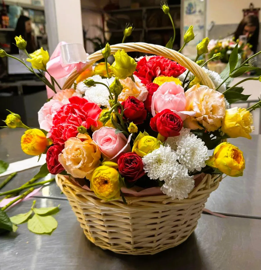 Все эти цветы искусно уложены в плетеную корзину, которая сама по себе является украшением, а нежный розовый бантик завязывает всю композицию, придавая ей завершенность и очарование. Эта цветочная корзина станет идеальным подарком для любого праздника, наполняя сердца радостью и светом.
