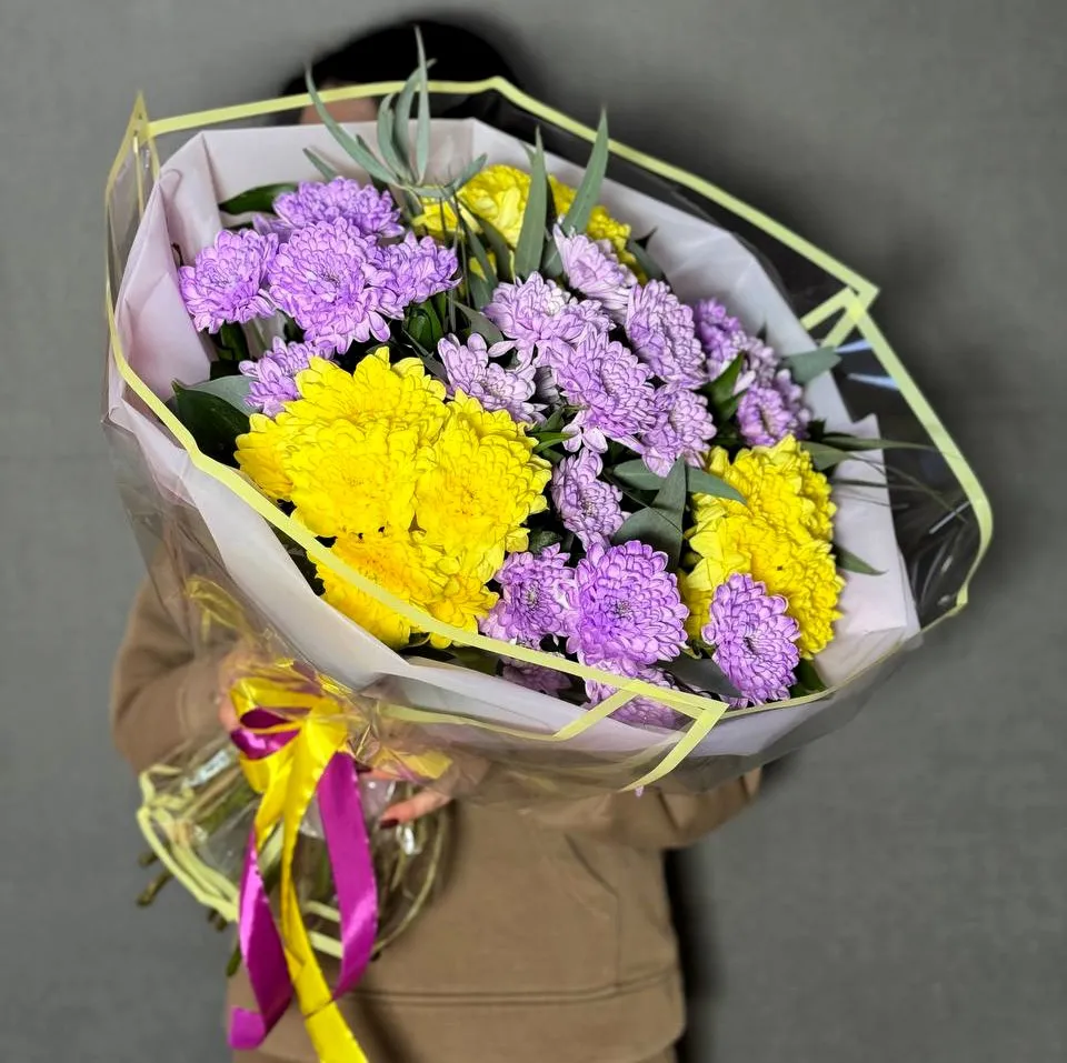 Такой букет не только привлекает внимание, но и создает удивительное настроение. Желтые хризантемы дарят тепло и солнечный свет, а фиолетовые создают атмосферу спокойствия и гармонии. Это отличный выбор для подарка на день рождения, юбилей или просто как знак внимания близким.