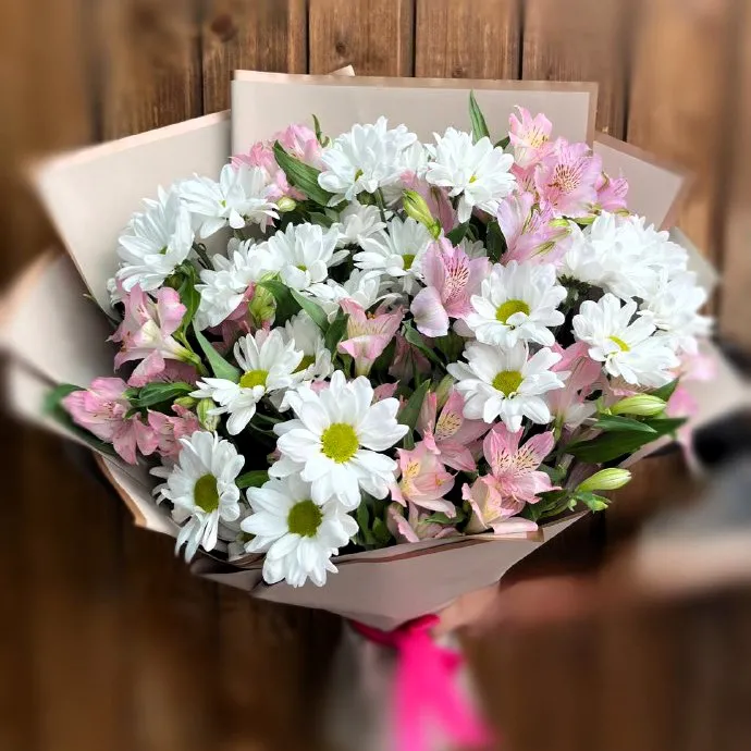 Не упустите возможность сделать праздник ярче и запоминающимся с помощью букета с кустовыми хризантемами и альстромериями – подарите радость и позитив своим близким!
