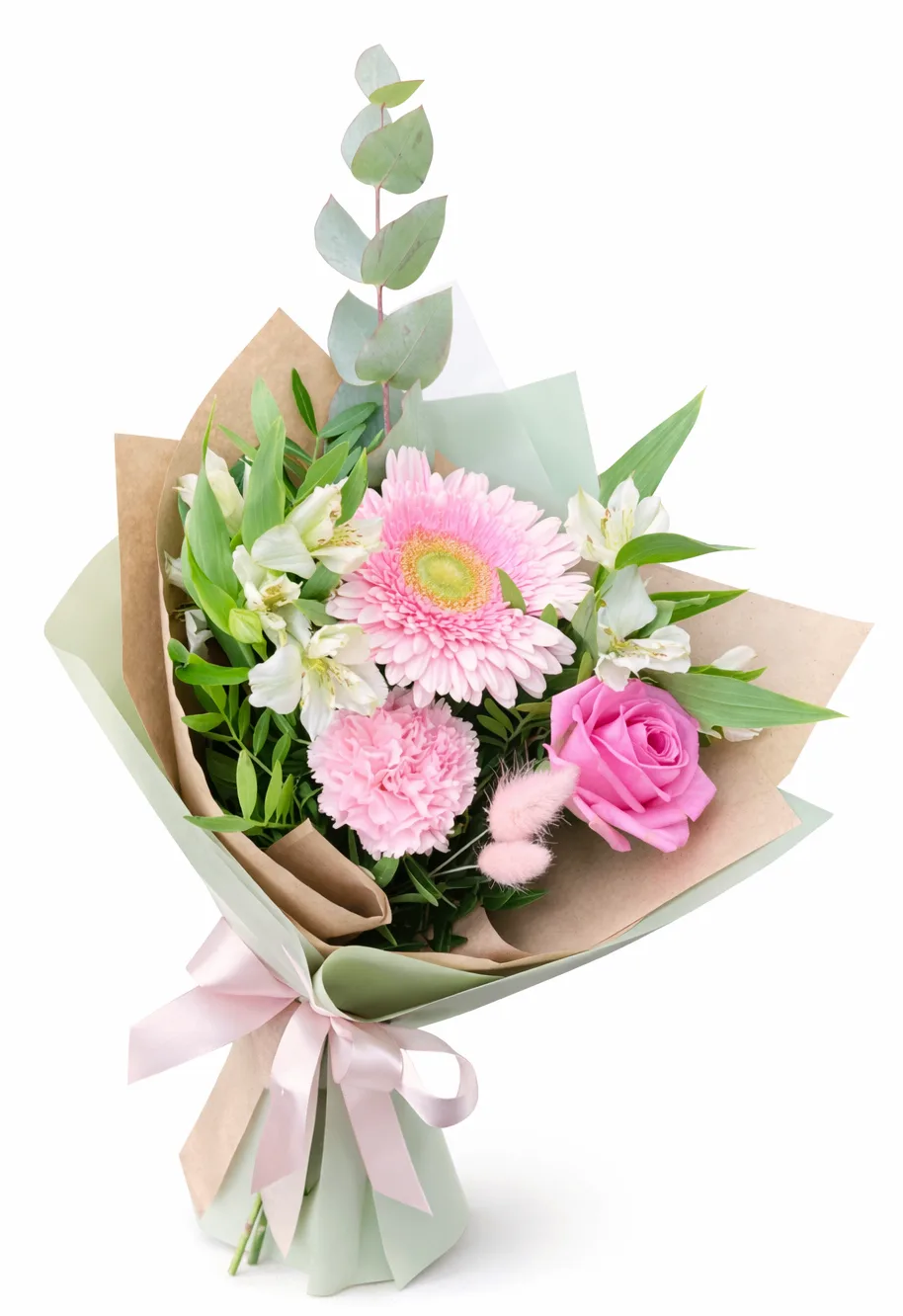 гербера-1шт, роза-1шт,гвоздика-1шт, алстромерия-2шт,зелень, упаковка, лента |