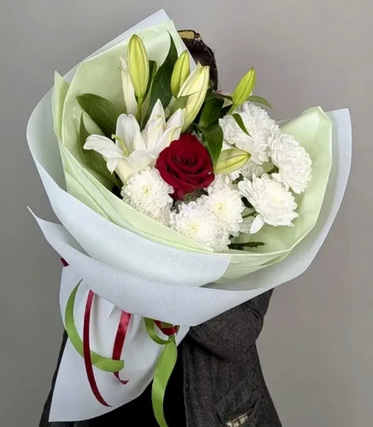 Лилии - 2шт, роза-1 шт, кустовая хризантема-1шт, упаковка, лента |