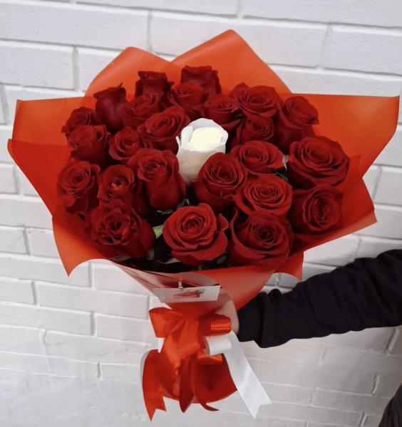 Такой букет выглядит эффектно и продуманно до мелочей: он передаёт историю, в которой есть место и страсти, и нежности. Стильная упаковка завершает композицию, придавая ей современный и торжественный вид, идеально подходящий для признания, юбилея или особенного события.