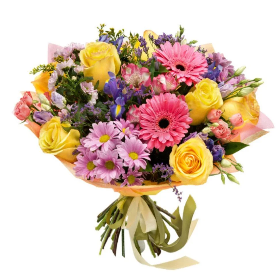 розы, герберы, альстромери, кустовые хризантемы, ирисы., зелень, упаковка, лента |