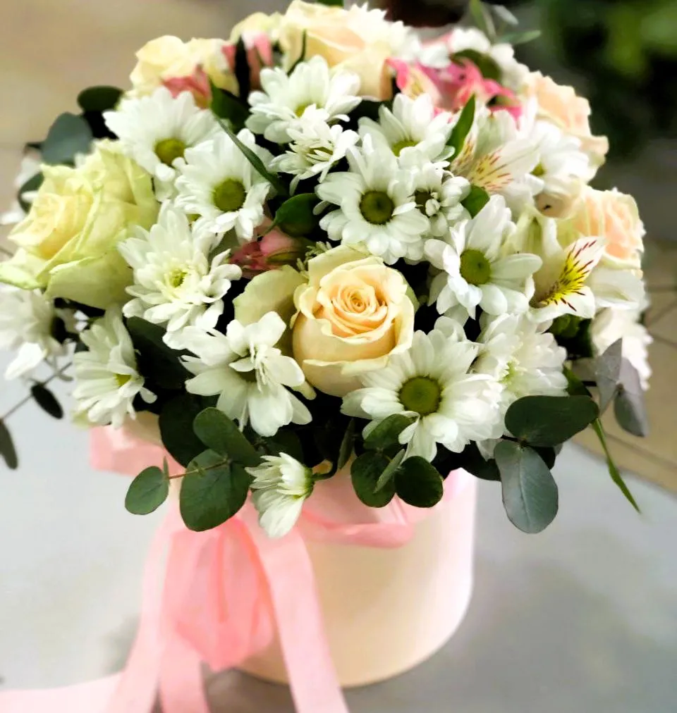 Кустовые хризантемы, розы, альстромерии, оазис,шляпная коробка |
