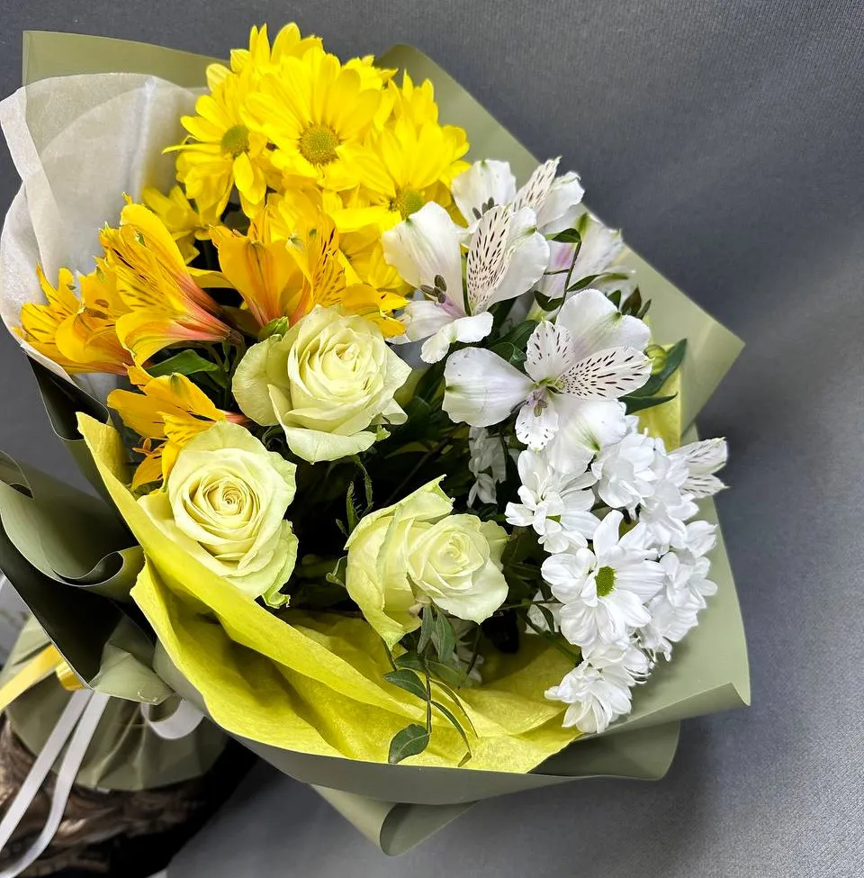 - Премиум - роза - 5 шт., хризантема - 3 шт., альстромерия - 4 шт., упаковка, лента