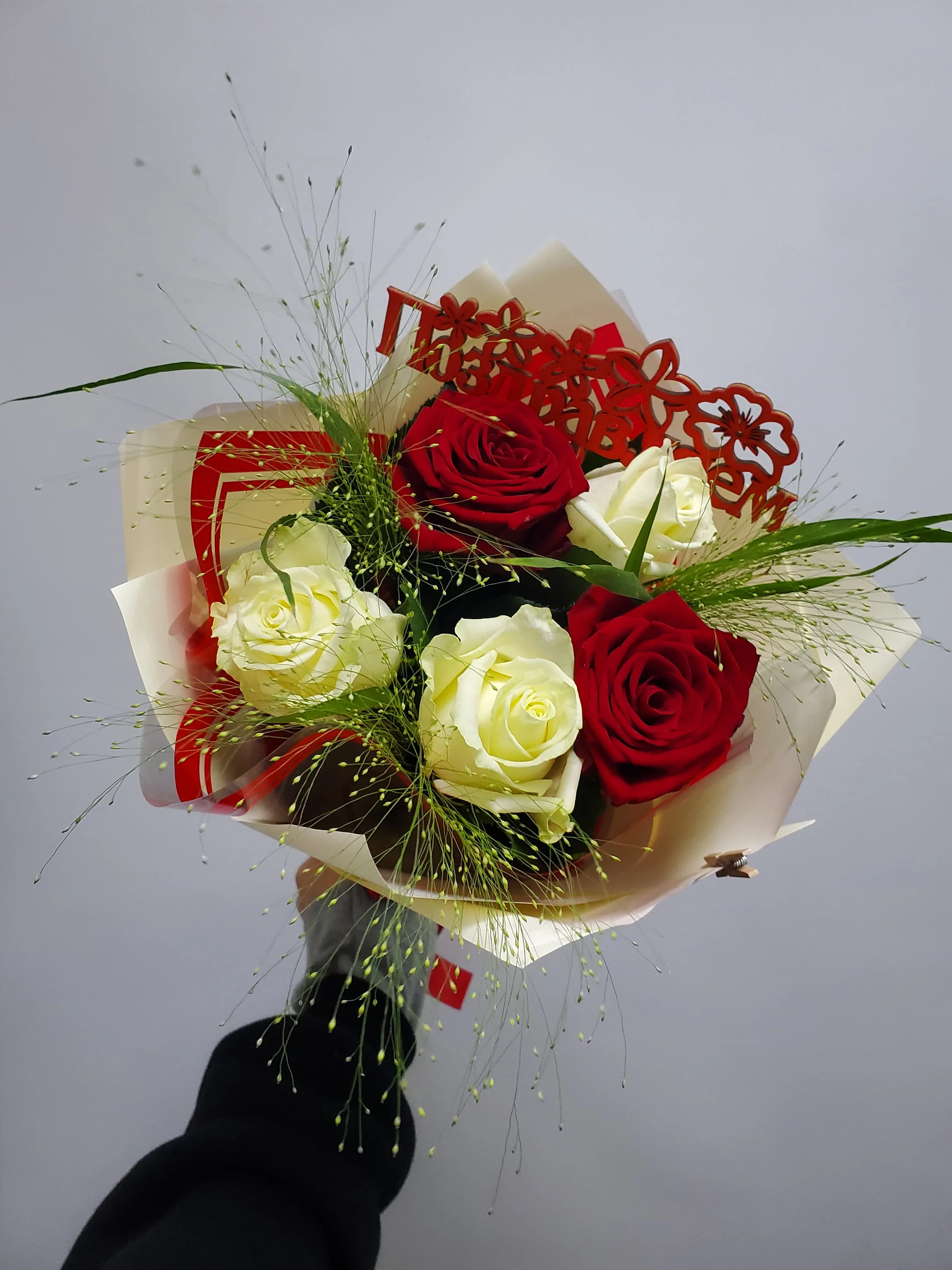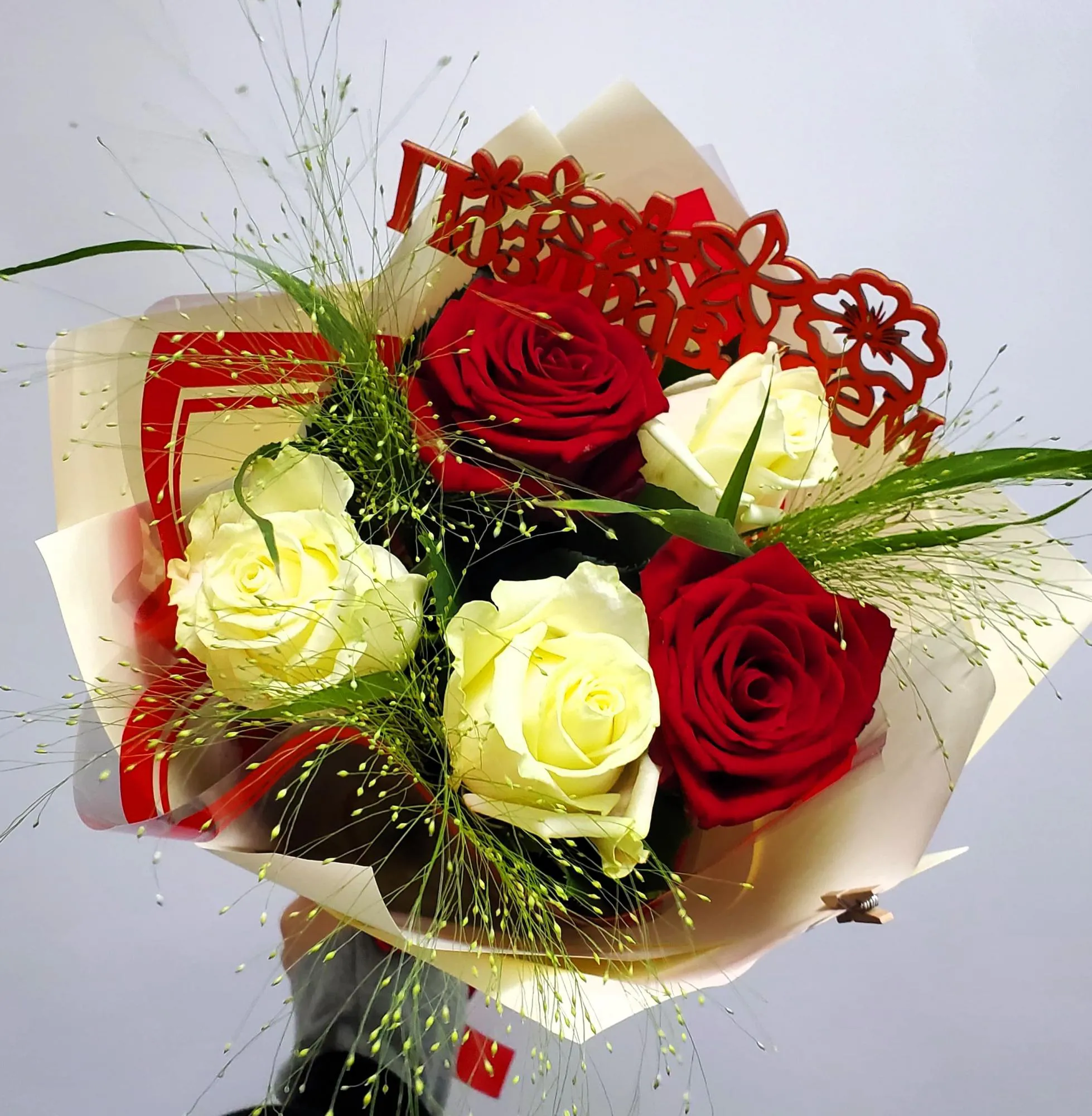 Роза красная и белая, зелень, упаковка, топпер, лента |