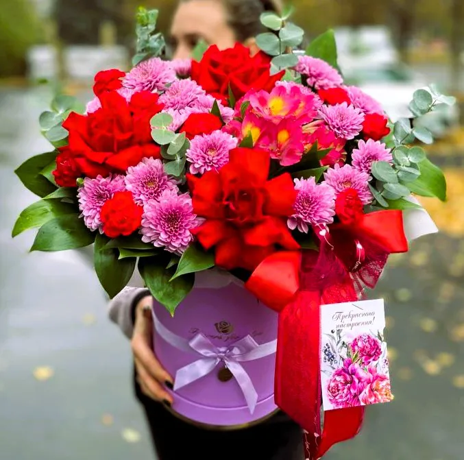 Розы,хризантема кустовая, гвоздика, альстромерии, оавзис,шляпная коробка |